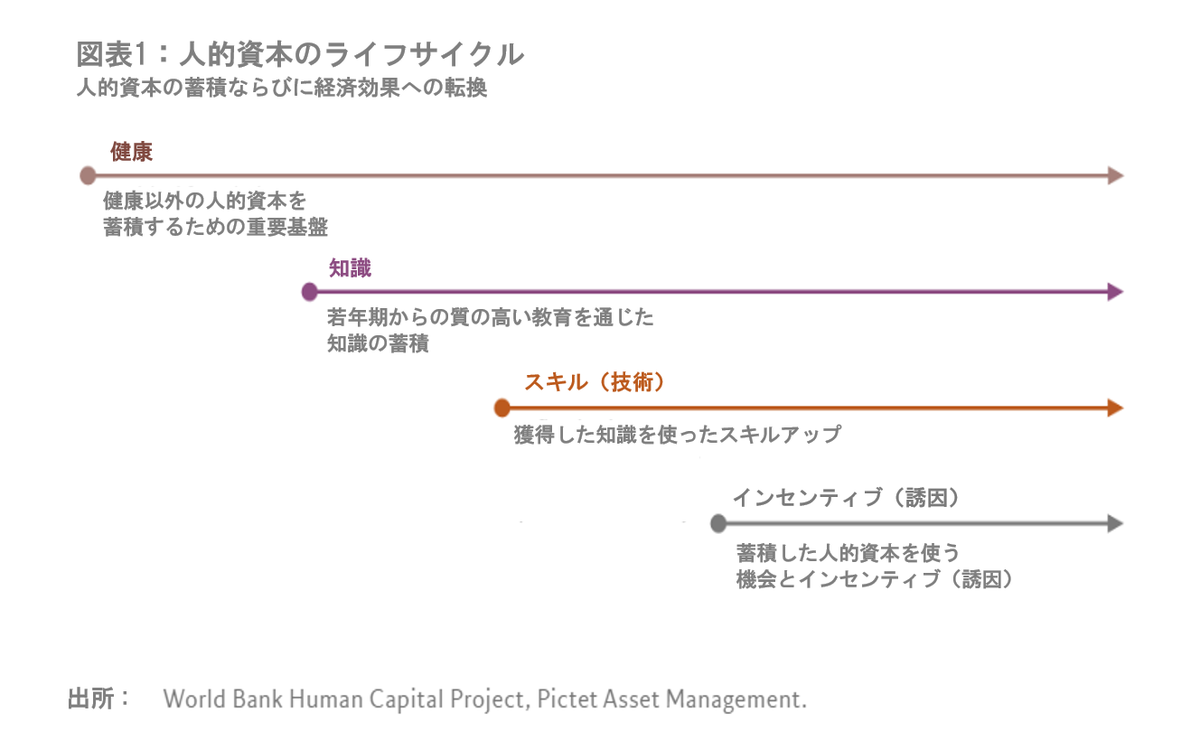 投資家は、資本の蓄積、借換、資本コスト、自然資本等、資本の動向を調べることに多大な労力を費やしています。しかし、寿命、教育、平等などの生活の質を表す人的資本も、経済の長期成長、ひいては、その延長線上にある投資パフォーマンスの重要な牽引役です1。
