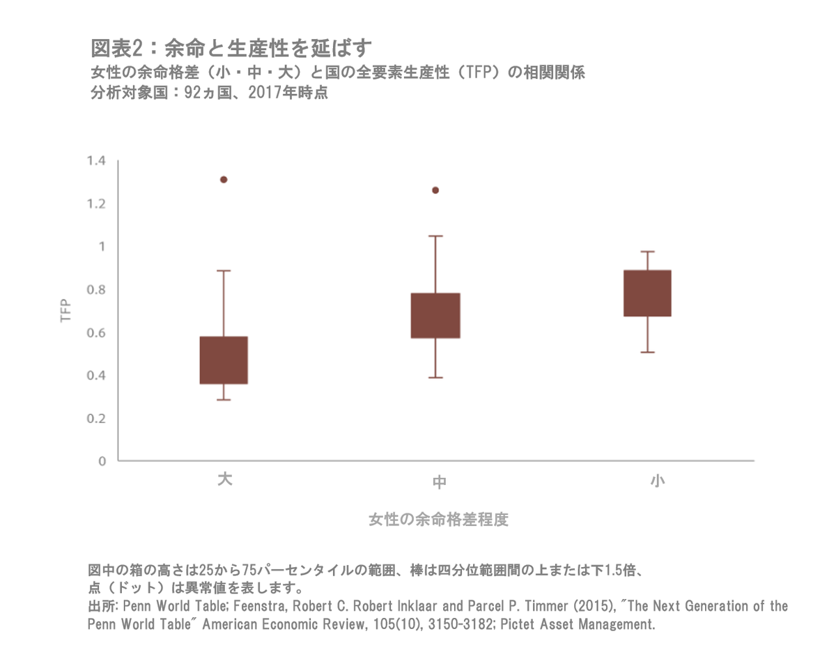 このことは、人的資本の様々な尺度で測っても、正しいことが分かります。例えば、ピクテの分析は、経済協力開発機構(OECD)が15歳児を対象に3年ごとに実施する「国際学習到達度調査」PISAの平均点3とTFPの間には強い相関関係があることを示唆しています。また、女性の出生時余命が著しく低い国にはTFPが低い傾向が認められます。発育不全により小児の体格が小さい国や栄養失調症の比率が高い国、男女ともに65歳以上の人口が全体に占める比率が相対的に低い国も同様です。