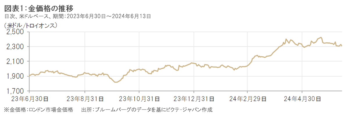 金価格は2023年末に当時の過去最高値を更新し、2024年3月以降は一段と騰勢を強めました(図表1参照)。5月中旬に新たに過去最高値を更新して以降は、米国の政策金利見通しの変化などに伴い上値の重い展開となっていますが、中長期的には地政学リスクの高まりなどの構造的な要因に加え、米国の金融政策の動向などが下支えする要因となり、上昇トレンドを維持することが期待されます。