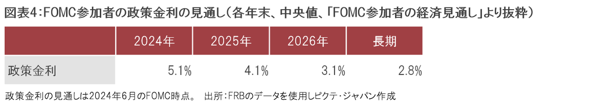 米国の金融政策を決定する会合である連邦公開市場委員会(FOMC)が6月に公表した声明や経済見通しでは、米国のインフレ圧力が緩和傾向にあるとの見解のほか、経済指標などを慎重に見極めながら2026年末にかけて段階的に複数回の利下げが実施されるとの見通しが改めて示されました(図表4参照)。インフレ動向を示す経済指標によっては、月ごとのブレが大きくなる傾向があることから、その内容によっては短期的に金価格の変動が大きくなる可能性がありますが、米国の金利が中長期的に低下すると見込まれることは、金価格にとってプラス要因になると考えられます。