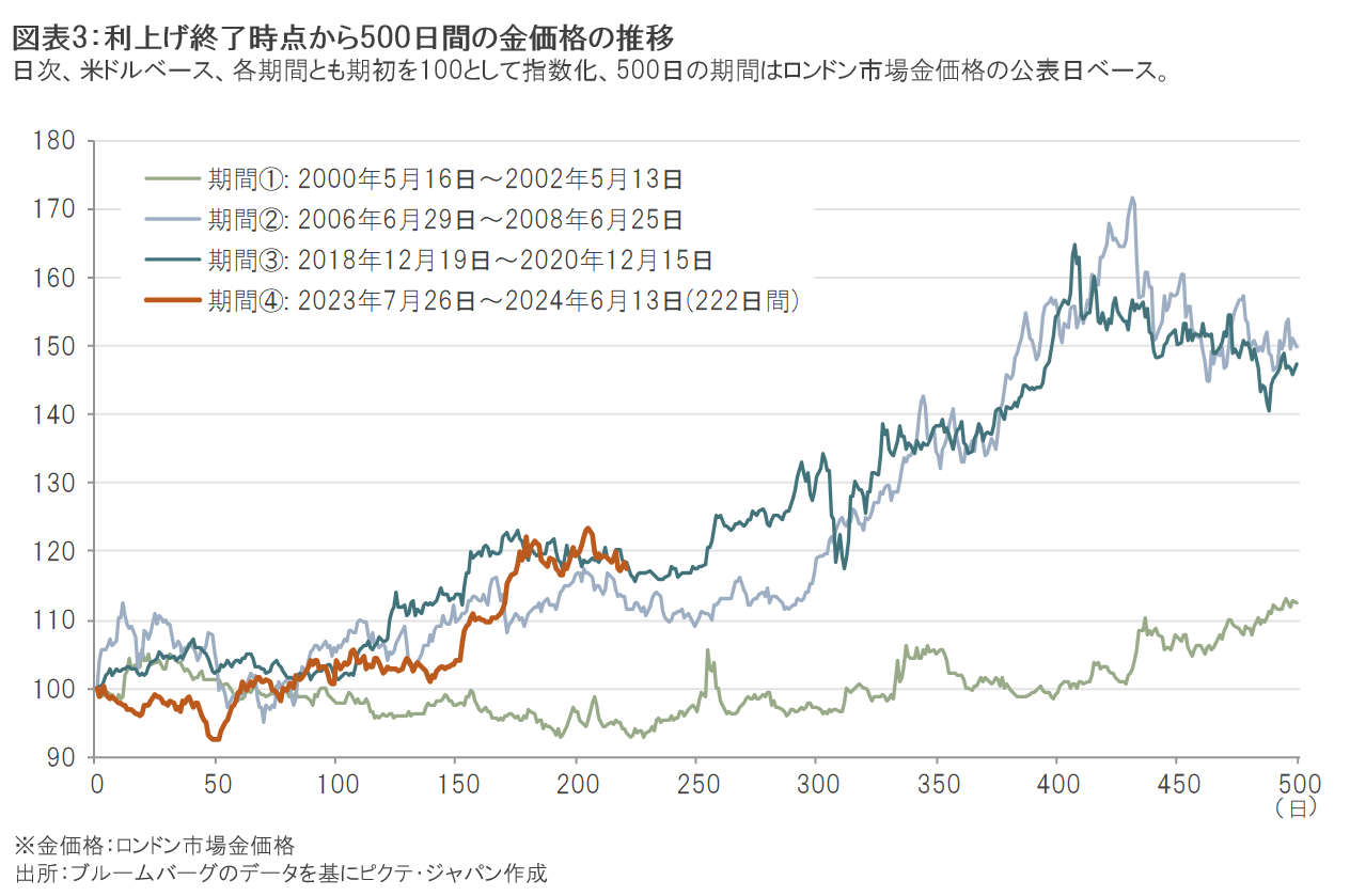 金は利息を生まない資産であるため、金利が低下する局面では投資対象としての相対的な魅力が高まることで、価格が上昇する傾向にあります。そのため、中長期的な金価格を見通す上では、特に米国の金融政策の動向が重要な要素となると考えられます。図表3は、2000年以降に米国の中央銀行が利上げサイクルを終了した時点を起点とした金価格の推移を示したものですが、これを見ると、利上げ終了後の金価格は短期的には下落したケースがある一方で、過去3回のうち2回(期間②と③)は、その後の景気後退に対応した利下げの実施に伴う米国金利の低下などを背景に大きく上昇しました。