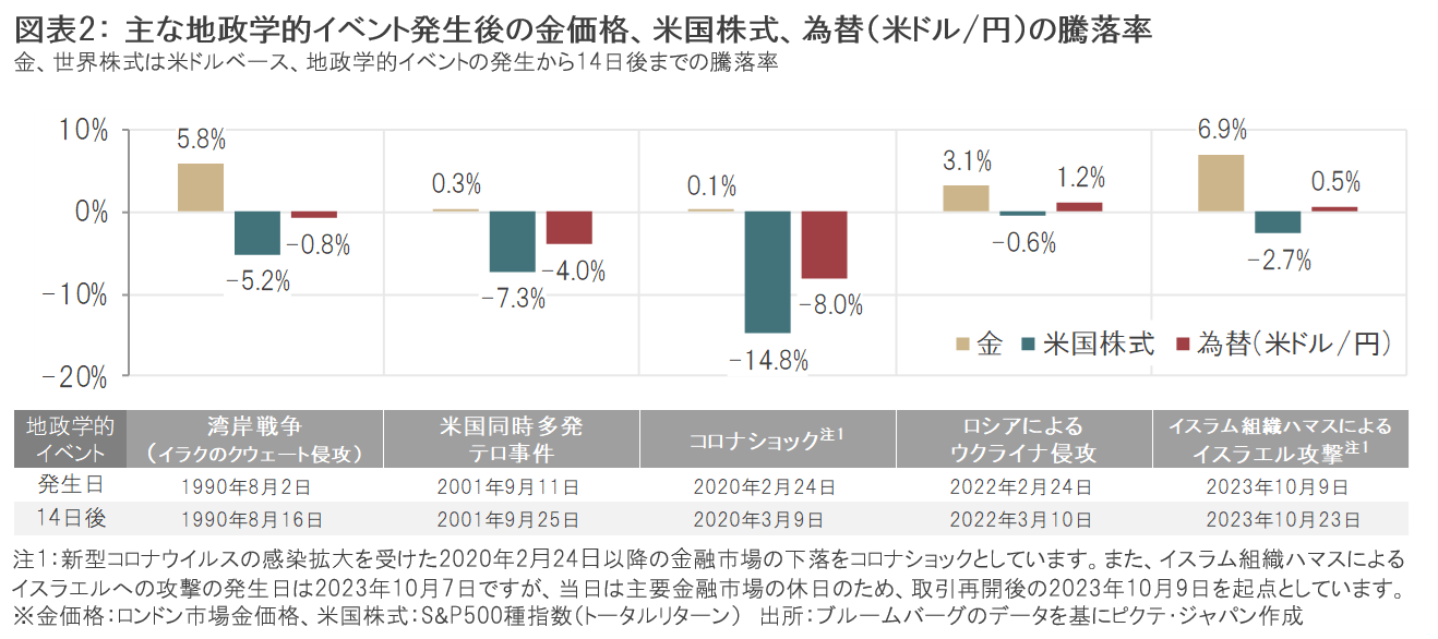 金は実物資産としてそのもの自体に価値を持ち、株式や債券のように発行体の信用リスクがないことから、地政学リスクが高まる局面などで資金の逃避先としての需要が高まる傾向があります(図表2参照)。