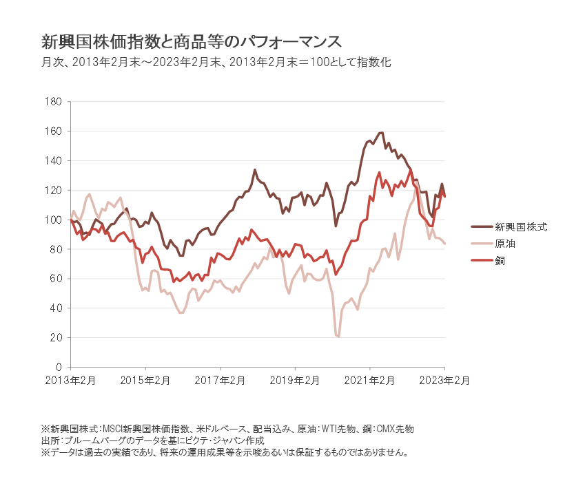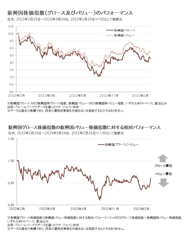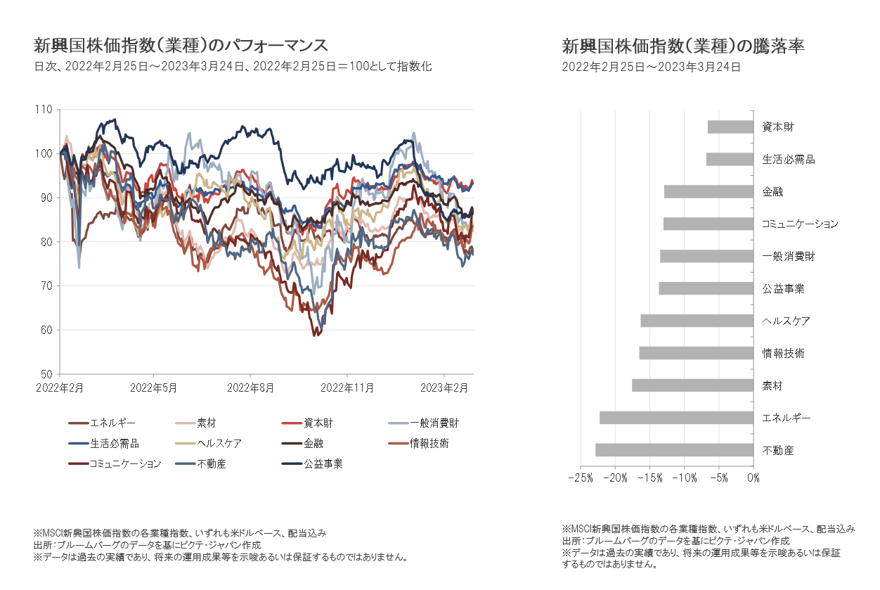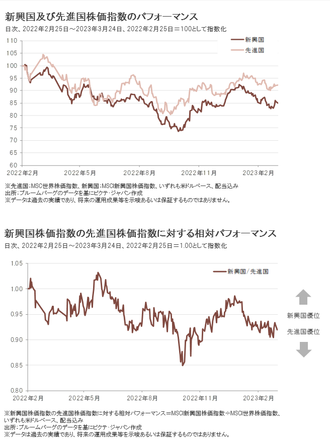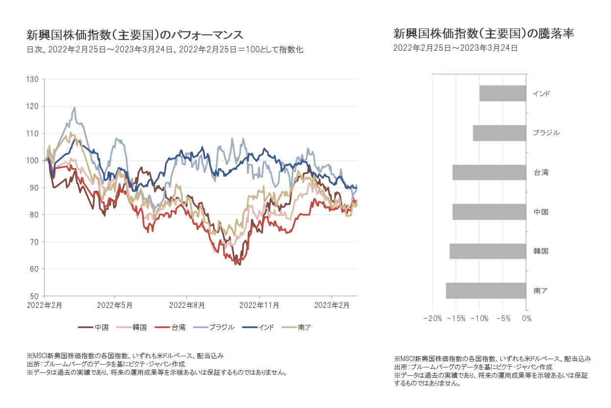 新興国株式市場は、同市場の中で時価総額が最も大きい中国を中心に、昨年10月の中国共産党大会での政策リスクや米国などの利上げを懸念して下落した後、中国のゼロコロナ政策の緩和や不動産市場対策などを好感して上昇しました。今年2月には米国で予想を上回る強い経済指標が発表されたことを背景に、米長期金利上昇や米ドル高が進行したことなどから下落基調となり、3月に入ってからも金融不安の中、軟調な展開が続いています。