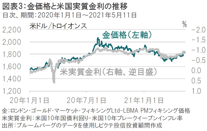 金価格は2021年3月末の1トロイオンス=1,700ドルを割り込む水準から、足元では同1,800ドルを超え、52週移動平均を上回るところまで上昇しています。金を取り巻く環境をみると、米国実質金利がマイナス圏にあり、さらに低下傾向を示していることや、米ドル安傾向、インフレ期待の高まりなどが金価格にとってプラスに働く可能性を示しているとみています。