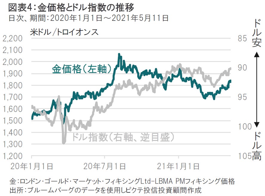 世界の主要通貨に対する米ドルの動きを示すドル・インデックスの推移をみると、米国長期金利の上昇を背景に2021年3月末にかけて上昇していましたが、米FRBが金融緩和継続を示唆したことなどを受けて米国長期金利の上昇が落ち着いたことに伴い、足元では下落基調となっています(図表4参照)。