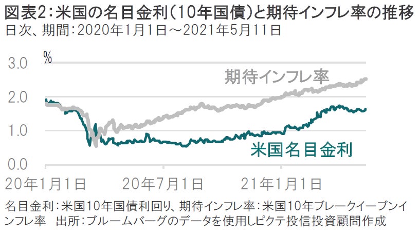昨年夏以降、上昇基調にあった米国の名目金利(10年国債)は2021年3月末にピークをつけた後、上昇に一服感がみられます。一方、インフレ期待については、根強いサプライチェーン問題に対する懸念や資源価格の高騰に加え、雇用や景気の回復スピードにも一服感が見え、金融緩和が継続するという期待が高まり、上昇基調が継続しています(図表2参照)。