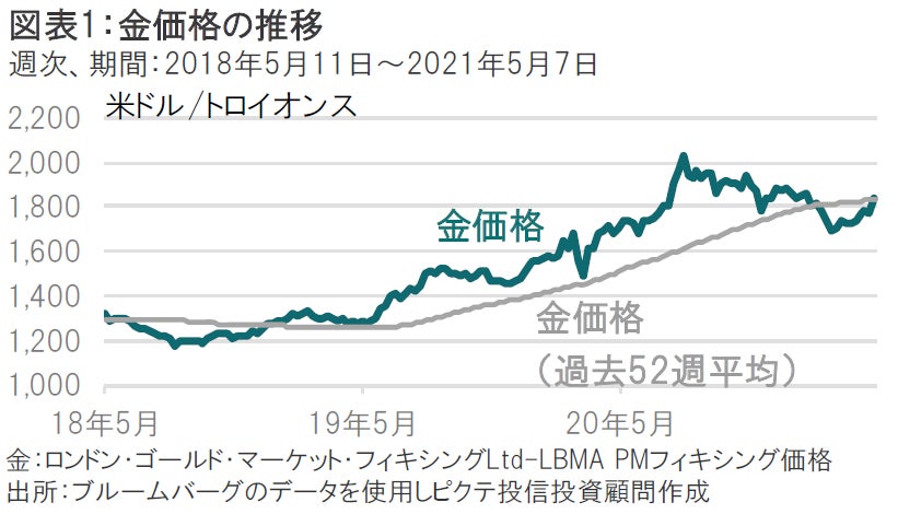 金価格は2021年3月末に1トロイオンス=1,700ドルを割り込む水準まで下落しましたが、その後、反発しています。5月7日時点では1トロイオンス=1,837ドルとなり、過去52週移動平均を約3ヵ月ぶりに上回りました(図表1参照)。