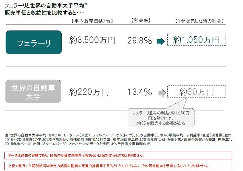 フェラーリ(イタリア)は高級スポーツカーに特化したプレミアム・ブランド企業であり、高価格・高収益のビジネス・モデルの代表格ともいえる企業です。フェラーリの1台あたりの平均販売単価はおよそ3,500万円(2019年度売上高と販売台数から算出)と超高額です。そして、利益率をみると業界大手企業の平均を大きく上回る高収益性を示しています。