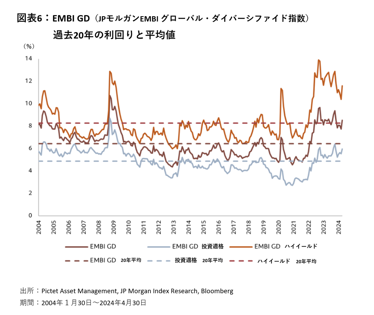 まず、利回りが高いことが挙げられますが、その要因の大部分は、無リスク資産と見なされている10年物米国国債の利回りが高いことです。米国のインフレ率が低下し、米連邦準備制度理事会(FRB)が金融緩和を開始すれば、新興国債券の利回りは低下する可能性があります。こうした高い利回りは、投資家にとっては魅力的な投資機会に見えるのです。