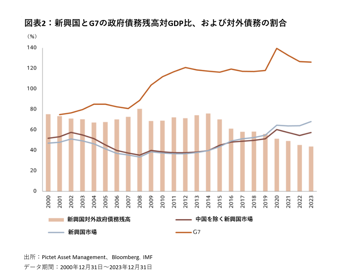 それだけでなく、投資家の逃避行動に対して、より脆弱性が低下しています。2008年には、新興国ソブリン債の81%が外貨、主に米ドル建てで発行されました。しかし、2023年にはその割合は44%まで減少しました。現在、新興国ソブリン債の大部分は、現地通貨建てで発行され、国内で資金調達されています。