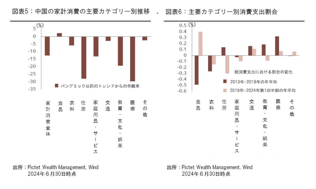1) 中国では個人所得の回復が比較的遅く、また所得格差が拡大していることにより、嗜好品に対する支出は、食品や衣料品などの生活必需品への支出よりも大幅に低下しています。そのため、嗜好品やサービスに関しては、パンデミック以前のトレンドからの乖離が大きくなっています(図表5)。住宅市場の低迷や物価の影響もあると思われ、特に住居や医療に関する支出においては、2020年以降、パンデミック以前の平均を明らかに下回っています。
