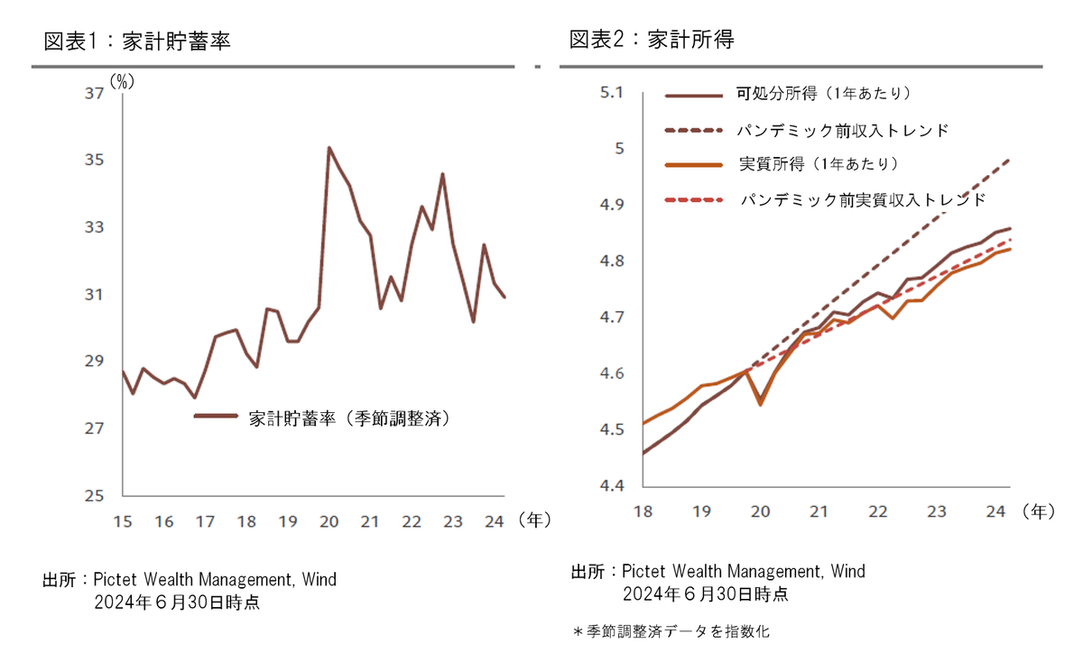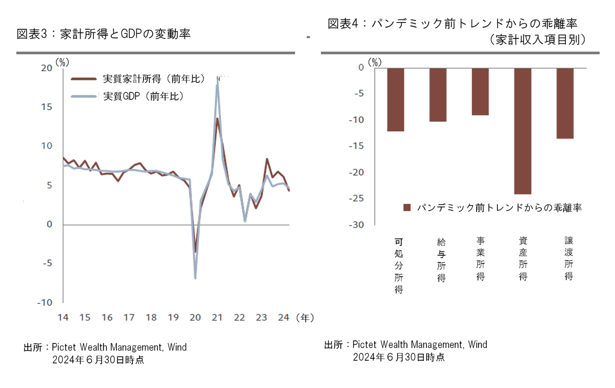 ・現在、中国ではGDP(国内総生産)成長率と密接に関係する家計所得が、消費の主な抑制要因となっており、貯蓄率はほぼパンデミック以前の水準に戻っています。また、株式や不動産市場の大幅な下落、政府の財政難などが、家計の資産所得や譲渡所得の伸びを鈍らせています。これらの項目は、パンデミック以前のトレンドから大きく乖離しています。