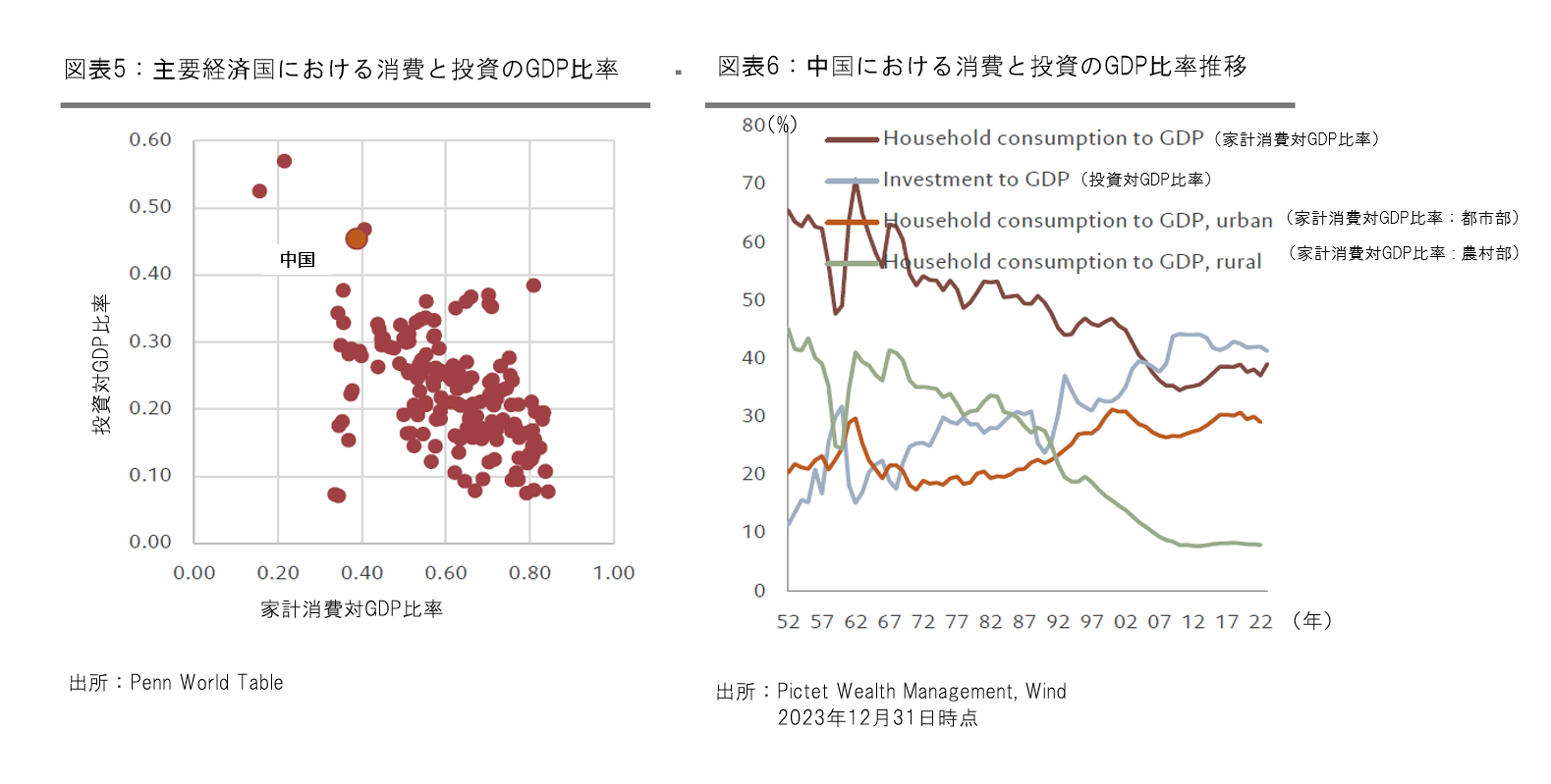 中国政府は長年にわたり、経済成長の構造改革のために国内の消費活動を推進してきましたが、GDPに占める家計消費支出の割合は主要国の中で最も低く、投資の割合は最も高い状況です(図表5)。中国の家計支出が比較的低い理由としては、3つの要因が挙げられます。