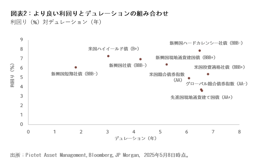 これらの重要な変化が進むにつれて、新興国現地通貨建て債券が先進国債券の代替手段として魅力を増していくはずです。図2が示すとおり、この資産クラスはすでに同格付けの米国投資適格債券よりも高いイールドと低いデュレーション・リスクを投資家に提供しています。