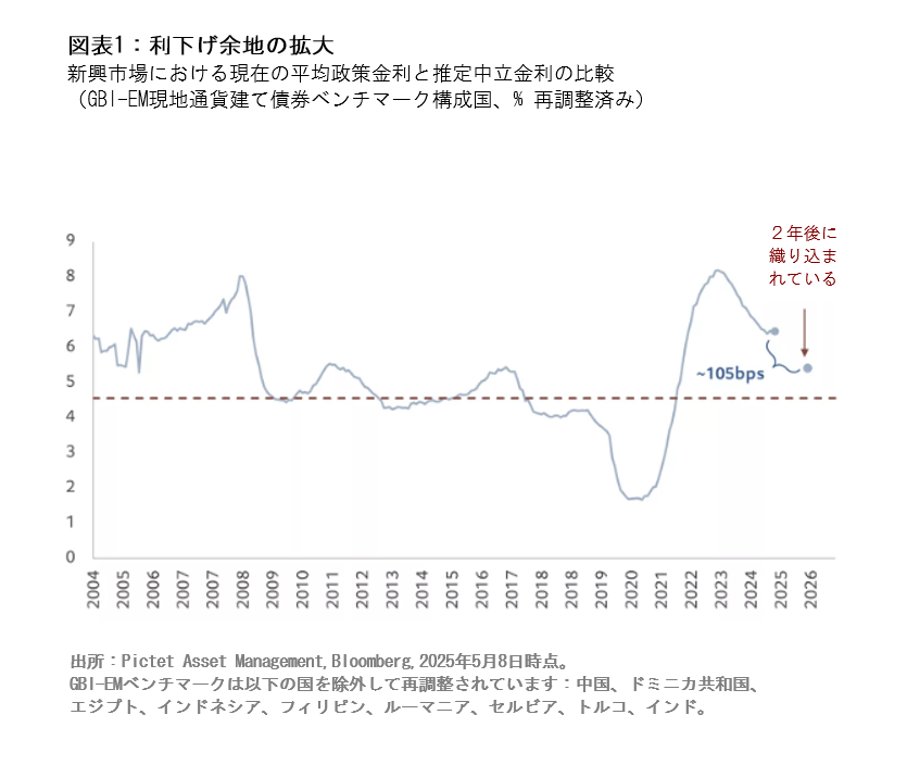 これにより、新興国全体で金利がさらに低下する余地が生まれるはずです。多くの新興国の政策金利は、中立的と考える水準を上回っています(図1参照)。中立金利とは、借り入れコストが過度に制約的でも刺激的でもない適切な水準のことです。