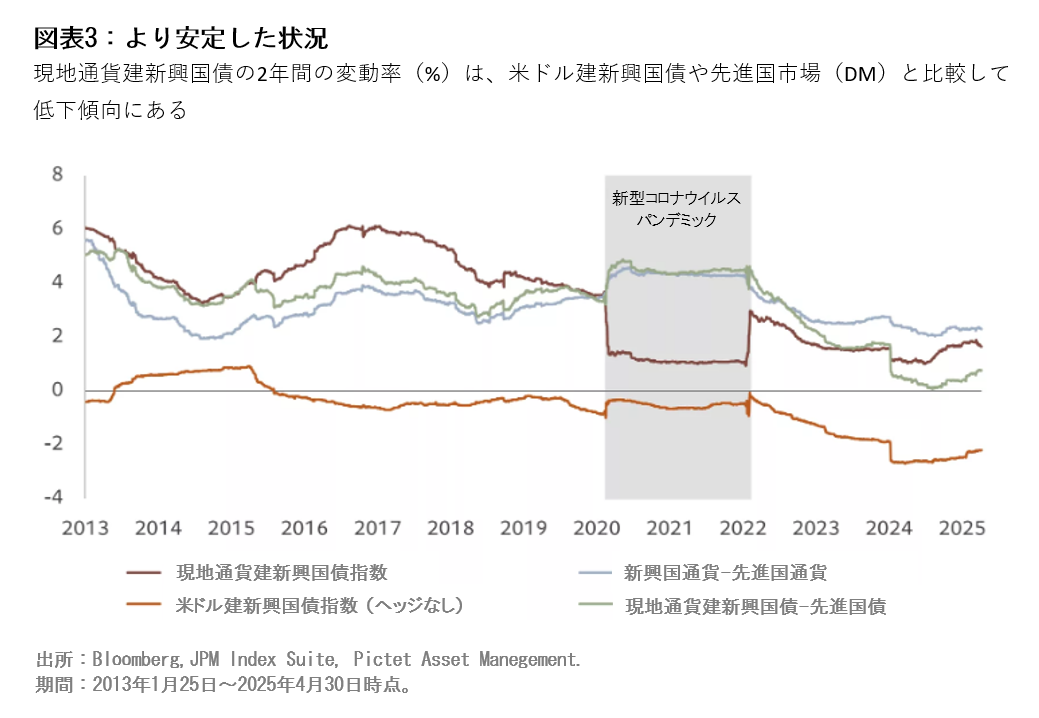 こうした動きが長期的に変動性を減少させ(図3参照)、現地通貨建て新興国債券の魅力を高めています。