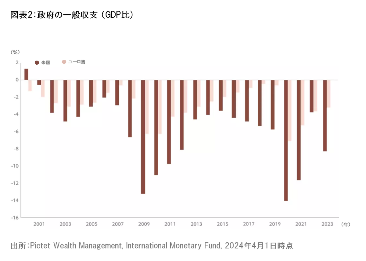 2024年11月の米大統領選の結果は、民主党と共和党が、貿易、移民、外交等について異なる政策を掲げていることから、今後数年間の経済環境を左右する可能性が大きいと考えます。二人の大統領候補のどちらが選ばれても、中国に対しては強硬な姿勢を貫くことが予想されますが、トランプ氏が関税の強化に訴えると思われるのに対し、ハリス氏は、投資の拡大や先端技術に係る規制の強化に重点を置くことを表明しています。トランプ氏の外交政策や移民政策はハリス氏の政策とは大きく異なり、インフレに大きな影響を及ぼす公算が大きいと思われます。どちらが選ばれても、巨額の政府債務や利払いの増加を受けて、財政収支は大幅な悪化が見込まれますが(図表2)、実態を伴った財政再建を行うとの政治的意思は、どちらの側にもほとんど見受けられません。