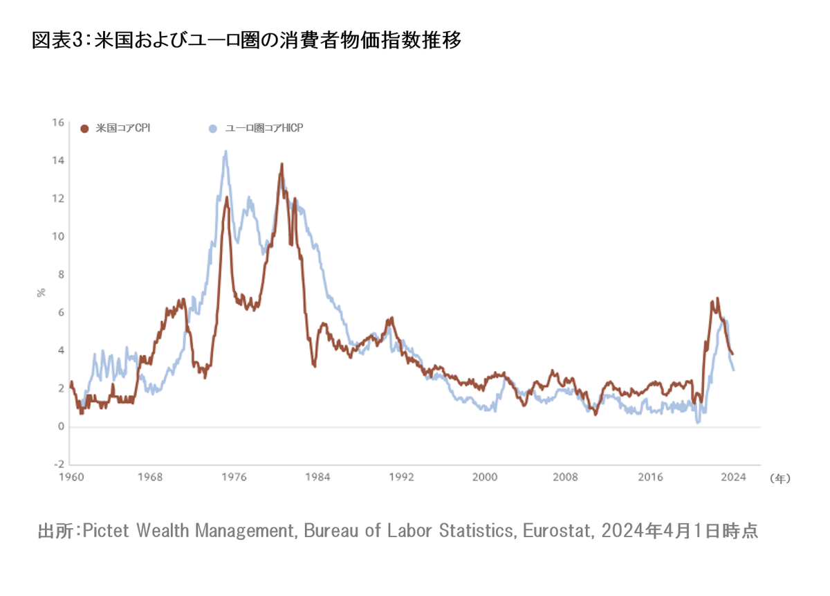 ユーロ圏のインフレは、2022年のエネルギー危機の最中にピークを迎え、その後は鈍化基調となり、2024年前半には欧州中央銀行(ECB)のインフレ目標である、2%近くまで低下しました(図表3)。インフレ鈍化の主な要因は、サプライチェーンの正常化と、7%近いピークから2024年年初には2%以下にまで低下したコア財のインフレですが、需要要因も寄与した可能性があるように思われます。実際、ユーロ圏と米国との決定的な違いは、ユーロ圏経済に、金利上昇分が、より迅速かつ強力に転嫁がなされてきたことです。2022年7月から2023年9月にかけてのわずか14ヶ月間で、ECBが中銀預金金利(預金ファシリティ金利)を-0.5%から+4%に引き上げたことが、信用サイクルの局面転換を遅らせ、経済成長全般に寄与したものと考えます。賃金の伸びには鈍化の兆しが現れ始めており、景気先行指標も、ユーロ圏経済に潜在する、インフレ圧力の正常化が続く状況を示唆していることから、ECBは年内の利下げに自信を深めているものと思われます。ECBはインフレ率を目標の2%を上回って推移すると予想しているため、中銀預金金利は2026年には2%にまで引き下げられるものと思われます。これは依然として、金融危機後の平均を上回る水準です。構造要因に起因して金利が高止まる環境では、公的部門、民間部門双方の巨額の債務が中央銀行の懸念材料であり続けると思われますが、2010年から2012年にかけての欧州債務危機との比較では、協調姿勢を強めるEU諸機関が、金融市場のシステミック・リスクと「経済の突然停止」に対する脆弱性を軽減していると考えます。