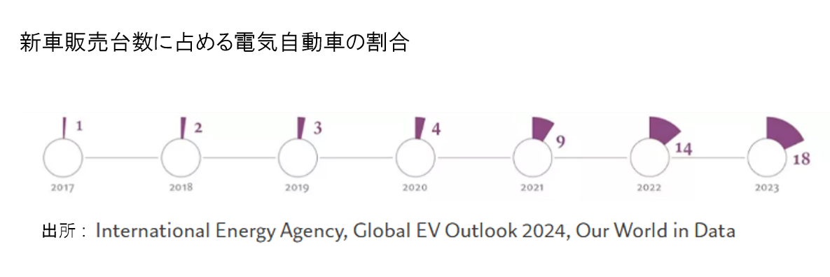 化石燃料の需要ピークが間近に迫る中、EVはすでに石油の消費量に影響を及ぼし始めています。交通・運輸関連は、世界の石油需要のおよそ45%を占めていますが、その大部分が自動車関連需要です。ガソリン車とディーゼル車をあわせた販売台数が2017年にピークを迎えた一方で、EVの販売は、2020年の約300万台から2023年には約2,000万台に急増しています。こうした傾向は、トラックの電動化の急速な進展を受け、今後も継続することが予想されます。また、世界の鉄道は半数以上がすでに電化されており、その割合はさらに増加しています。