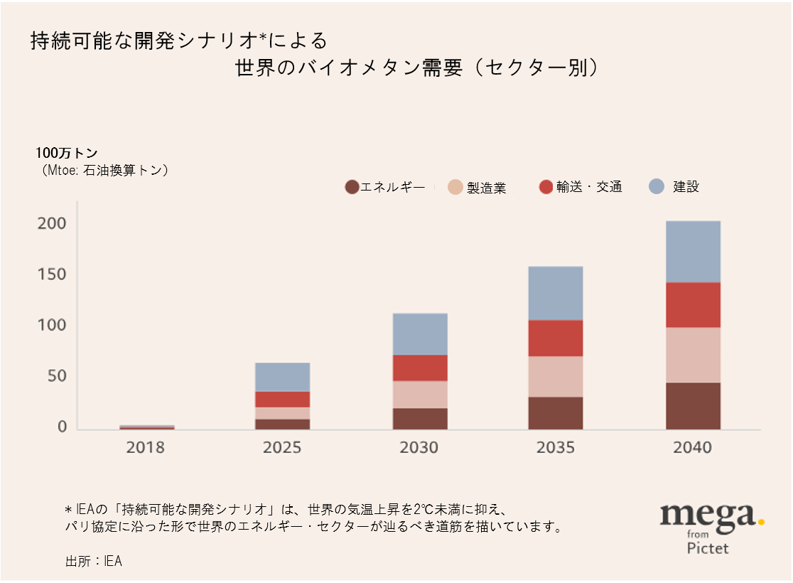 今後、需要の増大がRNGの生産拡大を後押しする可能性がありますが、IEAは2040年の世界の需要が2018年の約80倍に拡大するものと試算しています(図表参照)。