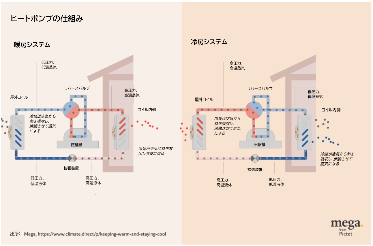 ここで、2つ目の重要な技術であるヒートポンプに話を移しましょう。ヒートポンプは19世紀に開発され、例えばデータセンターの排気口など、ある場所から熱を取り出し、それを家庭のラジエーターのような別の場所に集める仕組みです。また、このプロセスを逆に行うことで冷房も可能です。