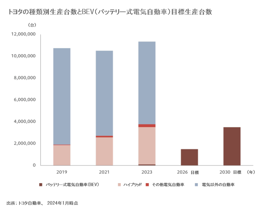 トヨタは、2023年に入って、2026年までに年間150万台のEVを生産し、全固体電池関連の技術革新を行うとの野心的な目標を設定しました(図表)。株式持ち合いの解消に向けた取り組みやガバナンス改善プロセスの策定等も、前向きな進展を示しています。