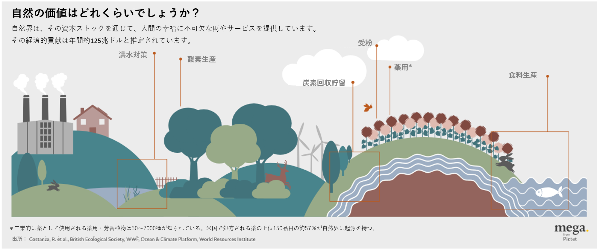 各国政府も協力的です。2022年に採択された、「昆明・モントリオール生物多様性枠組」と、「自然関連財務情報開示タスクフォース(TNFD)」の企業報告のためのガイドラインは、いずれも、規制環境の改善に資するものとなっています