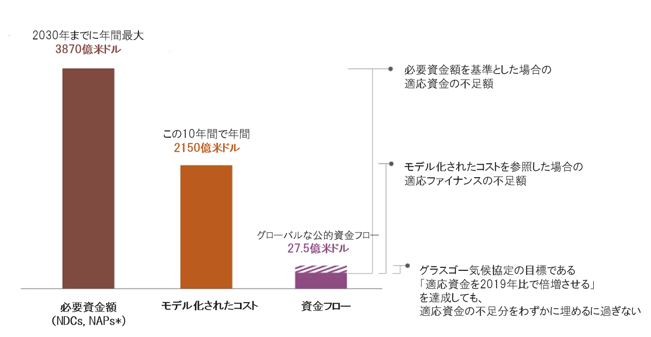 * モデル化された費用は、部門別モデルに基づく適応費用の見積もりである。適応資金の必要額は、開発途上国による報告に基づいている。