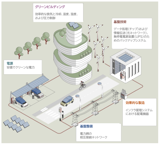 結論として、エネルギー転換は持続可能性の追求だけではなく、将来の経済成長を支える役割も担っています。クリーンエネルギーやエネルギー効率化技術への投資によって、未来の技術革新を支えるために必要な、安定的でサステナブルな電力を確保できます。このような変化は、ハードウェアやソフトウェア、インフラ、再生可能エネルギーに至るまで、データセンターのバリューチェーン全体に幅広い投資機会をもたらし、投資家にとって非常に魅力的な分野と言えます。