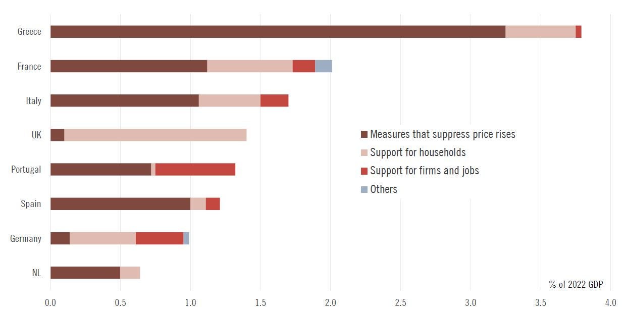 欧州各国の政府は、エネルギーショックに対応するため、個人や企業に対して様々な支援策を導入しており、その総額はGDPの1.5%を超えています。支援策としては、最終消費者のエネルギー価格上昇による影響を緩和するための規制、一部対象者への雇用支援策、減税などが挙げられます(図3)。