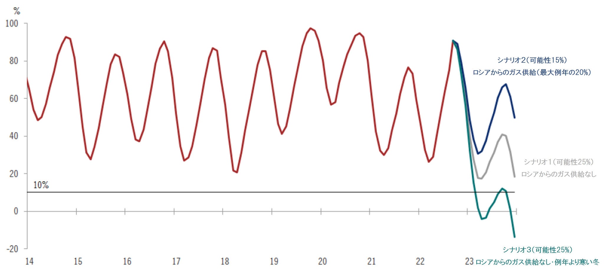 このシナリオでは、ロシアのガス供給量は現在の水準(2021年の約19%)を維持し、冬の気温は例年の平均値に近いと仮定しています。また、EUのガス消費量は約10%減少すると仮定します(欧州委員会の目標である消費量15%削減を若干下回る)。このようなシナリオでは、3月末の在庫は最大貯蔵容量の30%まで低下し、配給制の導入を回避することができるでしょう。しかしながら、この冬にロシアがエネルギーを武器として最大限に活用することが予想されるため、このシナリオの可能性は低いと見ています。