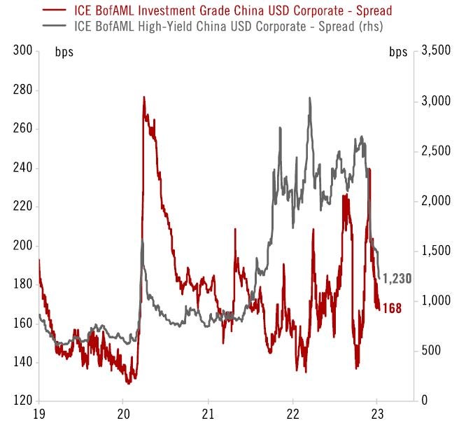 米ドル建ての中国社債は、ここ数週間、中国再開の恩恵をいち早く受けています(図3)。ICEバンク・オブ・アメリカの指数によると、投資適格債のトータルリターンは2022年11月4日から2023年1月11日の期間に6.8%となっており、ハイ・イールド債は同期間に異例の75.4%のリターンを記録しています。低格付けの多い不動産セクター(特にデベロッパー)を支援するための施策が進められていることも、ハイ・イールド債が大幅に上昇した要因の一つとして考えられるでしょう。