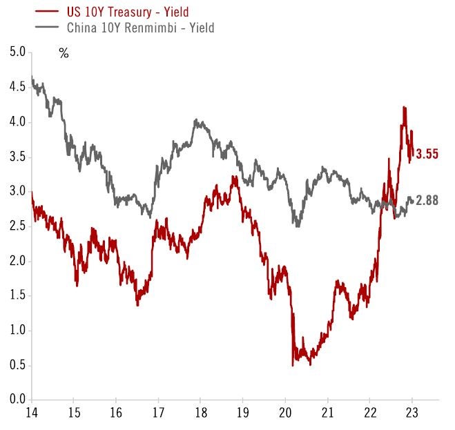 中国と米国の10年国債利回りのスプレッドは依然としてマイナス圏で推移していますが、中国は経済回復により利回りが上昇し、米国は景気後退と金融引き締めの緩和により利回りが低下する可能性があるため、年末にかけてスプレッドは縮小すると考えられます。