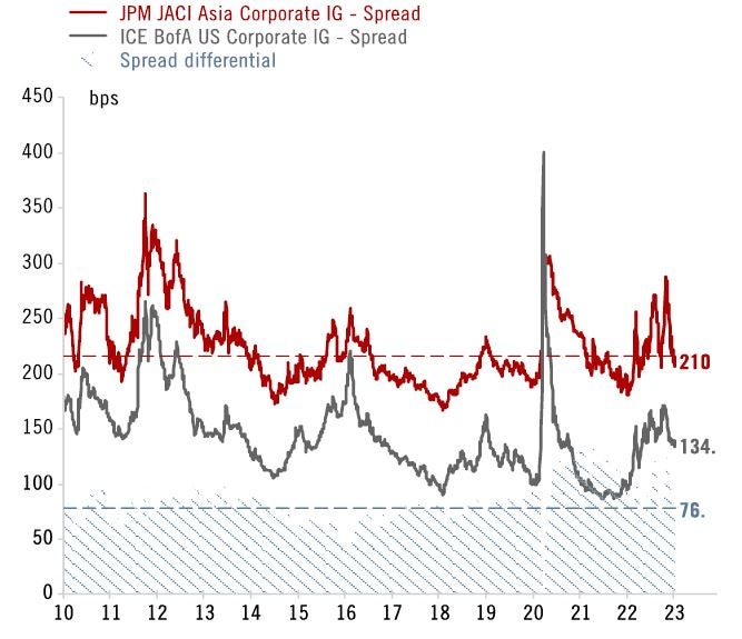 投資家は米ドル建て新興国投資適格社債からキャリー獲得の機会を得られる可能性があると考えています。その中でも、アジア市場は中国の経済活動再開の恩恵を大きく受けるでしょう。アジアの投資適格社債は、スプレッドが拡大する可能性はあるものの(図4)、高い利回りが貢献し(JP Morgan JACI Investment Grade Corporate指数の利回りは5.74%、1月11日時点)、年間のトータルリターンはプラスとなると思われます。また、中国の景気回復が追い風となり、その他新興国と比べ、アジアのクレジット市場が下半期で先進国クレジット・スプレッド拡大の影響を受けるリスクは相対的に低いと考えます。そのため、欧米の景気後退リスクを考慮し、新興国では投資適格債券市場への投資を優先し、ハイ・イールド債券市場への投資には慎重になるべきでしょう。