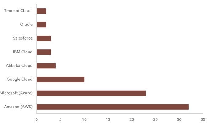 第一に、クラウドインフラプロバイダーです。データ中心の生成型AIは、ハイパースケーラーと呼ばれる大規模なクラウドプラットフォームが提供する強力なクラウドインフラを必要とします。AWS(アマゾンウェブサービス)、GCP(グーグルクラウドプラットフォーム)、Microsoft Azure(マイクロソフトアジュール)などがそれにあたります。 これらを合わせると、世界のクラウド容量の約78%を占めています(図2参照)。2023年1~3月期のクラウドインフラサービスの売上高は、前年同期比100億米ドル増の637億米ドルに達しており、今後も力強い成長が期待されます。