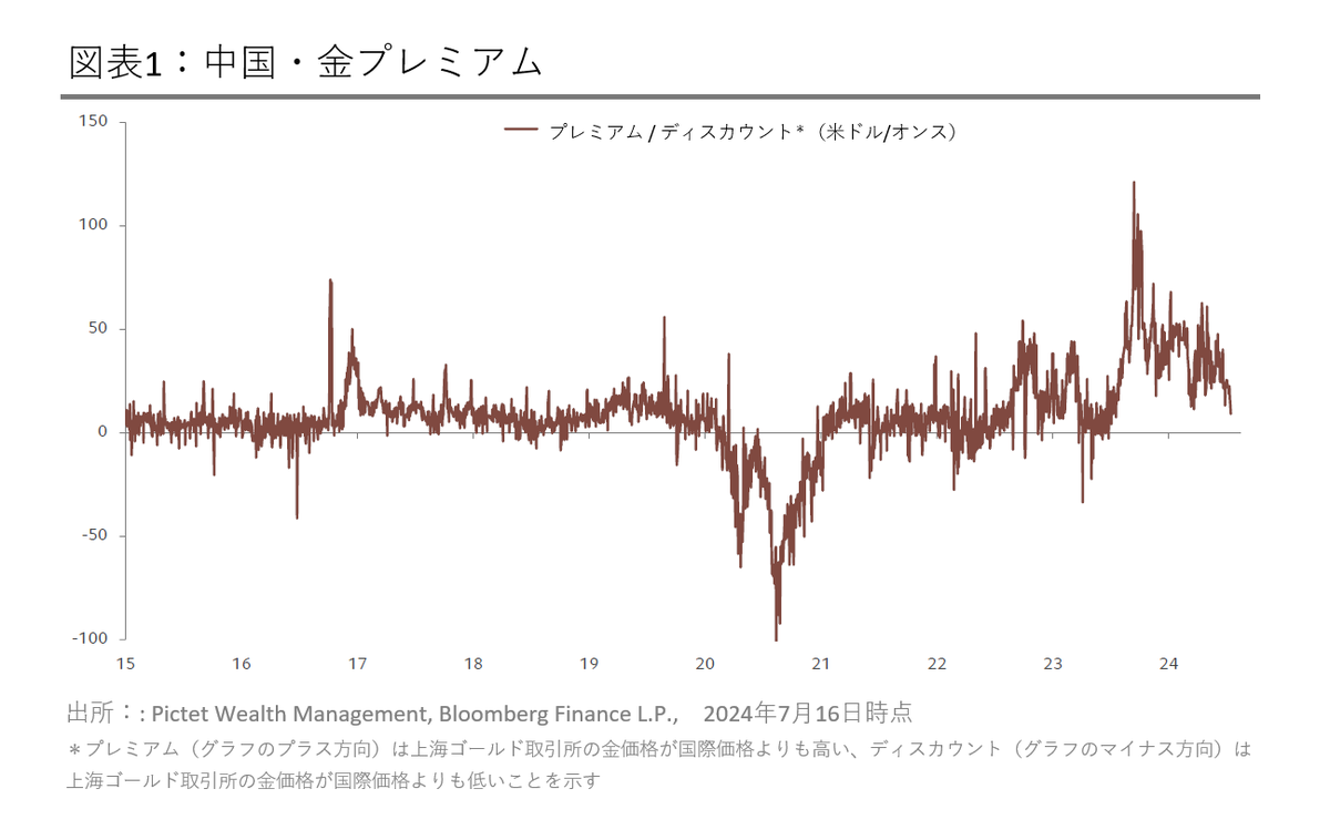 金価格は2024年4月中旬以降、歴史的な高水準で安定しています。しかし、価格高騰により需要の勢いが鈍化しています。特に、金の値ごろ感の低下と季節的要因が影響し、2024年8月末頃まで宝飾品需要が弱い状態が続くと予想されます。また、長期的に金の保有比率を増やそうとしている中央銀行も、より魅力的な価格を待つ可能性があります。さらに、国際金価格(ロンドン市場金価格)と上海金取引所の価格との差で示される中国の金現物需要も最近減少しています(図表1)。