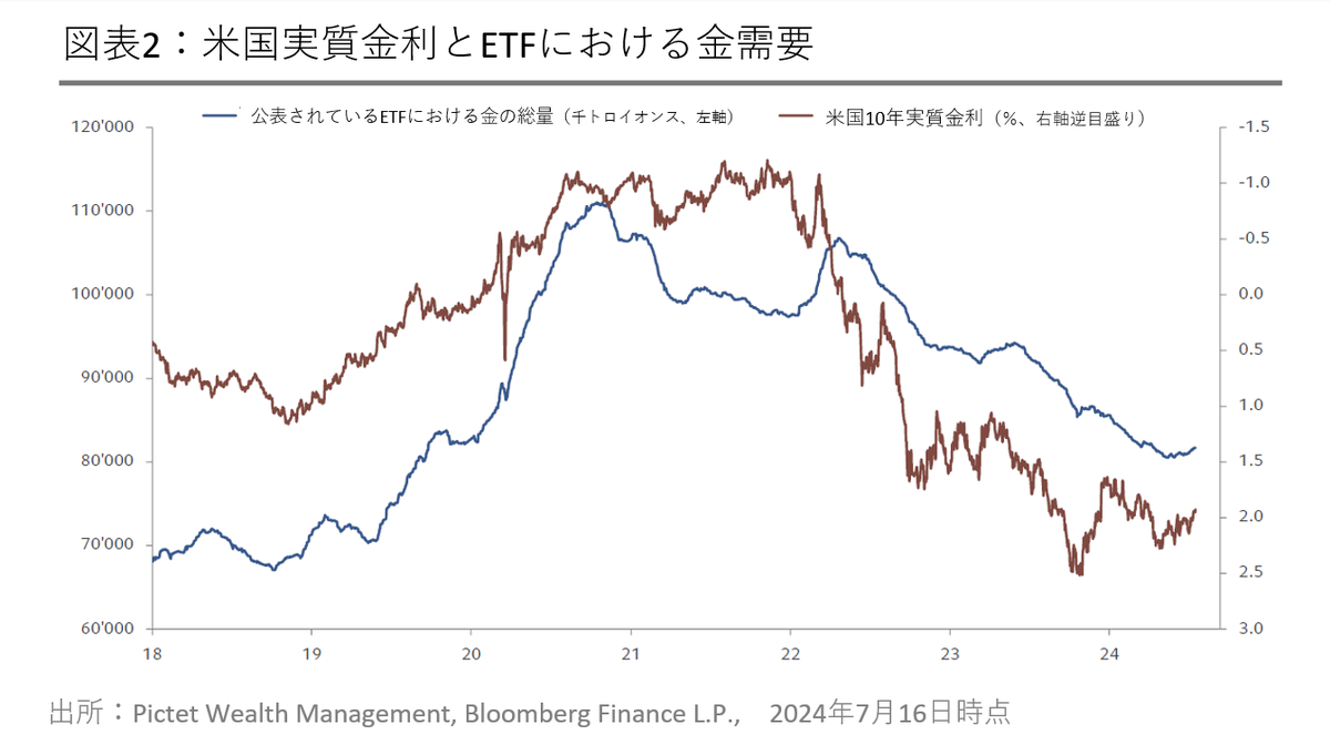 公的セクターからの強い需要が続いていることに加えて、ピクテが中期的な金価格について強気な見方を維持する理由は二つあります。第一に、数ヶ月にわたって金への投資が停滞した後に、ETF需要が改善する余地があると見ています。FRBの緩和サイクルの開始は、金利の低下に伴って金を保有する機会費用が低く抑えられるため、この需要を一部後押しするでしょう(図表2)。第二に、中国で金の実需が再び強まる可能性があります。米国の次期大統領が誰になるかによりますが、中国の対米輸出品に対する関税引き上げの脅威は、人民元の下落圧力につながり、その結果、中国の金需要が強まる可能性があります。米国の大統領選挙に加えて、中国の経済見通しは依然として低調であり、中国国内の金融政策は低いインフレ圧力を考慮すると、すぐには引き締められない見込みです。この政策の組み合わせは人民元を支えるものではありません。さらに、中国の輸出に対する規制を検討している国が増えていることも、人民元に対する下押し圧力につながる可能性があります。総じて、今後数四半期にわたって中国における金需要が再び増加すると予想しています。