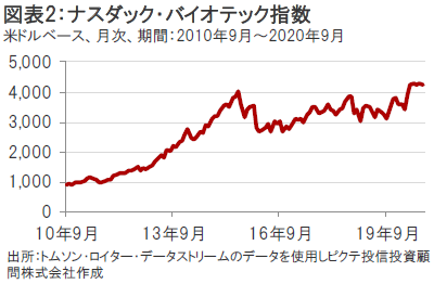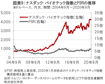 足元、新型コロナウイルスの治療薬およびワクチン開発への期待やバイオ医薬品企業の業績が景気動向に左右されにくい特性などが注目されて株価が上昇しており、PSR(株価売上高倍率)で見たバリュエーション(投資価値評価)の水準も上昇しています。(図表9参照)