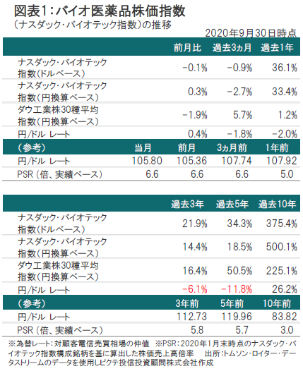 9月のナスダック・バイオテック指数(ドルベース、配当含まず)は小幅に下落しました。