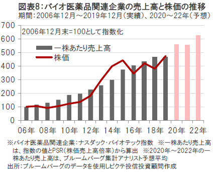 過去の実績では、バイオ医薬品関連企業の株価は、売上高の伸びとともに上昇してきたことがわかります。(図表8参照)