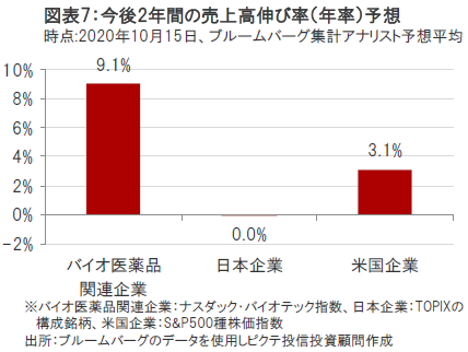 バイオ医薬品関連企業については、①有望な治療薬候補の良好な治験結果の発表、②大型の新薬の承認、③新薬販売開始後の業績寄与の拡大などを背景に、米国企業や日本企業よりも相対的に高い売上高の伸びが見込まれています。(図表7参照)