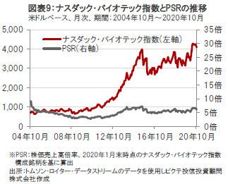 足元、新型コロナウイルスの治療薬およびワクチン開発への期待やバイオ医薬品企業の業績が景気動向に左右されにくい特性などが注目されて株価が上昇しており、PSR(株価売上高倍率)で見たバリュエーション(投資価値評価)の水準も上昇しています。(図表9参照)