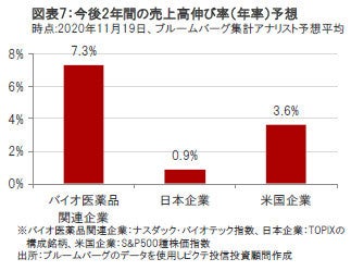 バイオ医薬品関連企業については、①有望な治療薬候補の良好な治験結果の発表、②大型の新薬の承認、③新薬販売開始後の業績寄与の拡大などを背景に、米国企業や日本企業よりも相対的に高い売上高の伸びが見込まれています。(図表7参照)