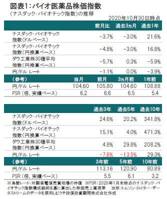 10月のバイオ医薬品セクターは、米大統領選を11月初めに控えて選挙戦の行方が注目を集める中、新型コロナウイルス・ワクチン開発の進捗状況が期待されましたが、十分な症例が集まらなかったとして治験結果の発表はありませんでした。