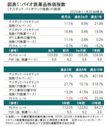 11月のナスダック・バイオテック指数(ドルベース、配当含まず)は上昇しました。