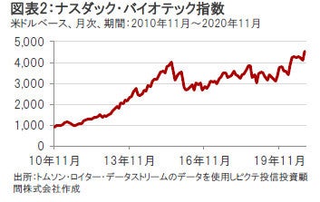さらに米上院で共和党、民主党どちらが過半数を確保するかを決定するジョージア州の2議席の決選投票も重要なイベントです。バイデン大統領の誕生により、混沌とした状況が改善し、科学や規制当局への信頼性を高め、科学分野への政府支出を増やす可能性があります。一方、ねじれ状態の連邦議会は、超党派の支援がなければ法律を制定することが難しく、法案が急進的なものではなくより穏健なものになることを意味しています。民主党、共和党の超党派で進めているメディケア(高齢者向けの医療保険プログラム)の改革の動きが、医薬品の価格の引き下げにつながる可能性がありますが、量的増加につながり、全体的にはポジティブに働くと考えます。