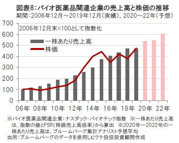 過去の実績では、バイオ医薬品関連企業の株価は、売上高の伸びとともに上昇してきたことがわかります。(図表8参照)