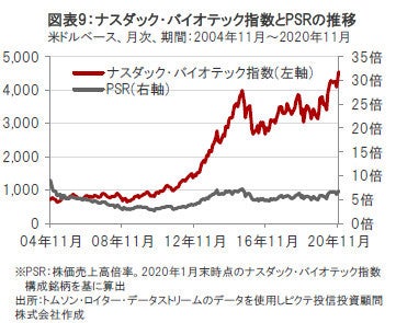 足元、新型コロナウイルスの治療薬およびワクチン開発への期待やバイオ医薬品企業の業績が景気動向に左右されにくい特性などが注目されて株価が上昇しており、PSR(株価売上高倍率)で見たバリュエーション(投資価値評価)の水準も上昇しています。(図表9参照)