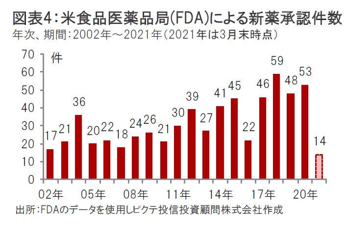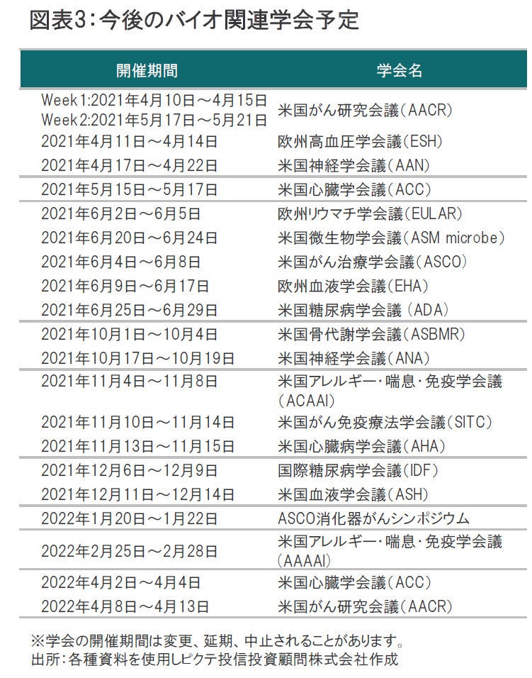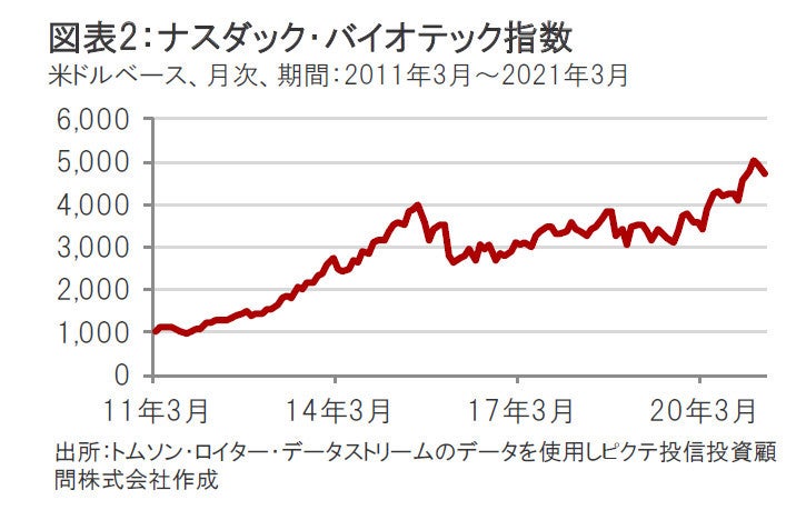 バイオ医薬品セクターについては、短期的には新型コロナウイルスの感染動向とワクチンの動向に注目が集まっています。一部の製薬企業やバイオ医薬品企業は引き続き新型コロナウイルスの治療薬やワクチンの開発を急ピッチで行っています。ワクチンの良好な治験結果や各国政府によるワクチン接種はすすめられており、現在は生産能力などのボトルネックに注目が集まっています。