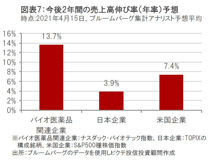 バイオ医薬品関連企業については、①有望な治療薬候補の良好な治験結果の発表、②大型の新薬の承認、③新薬販売開始後の業績寄与の拡大などを背景に、米国企業や日本企業よりも相対的に高い売上高の伸びが見込まれています。(図表7参照)